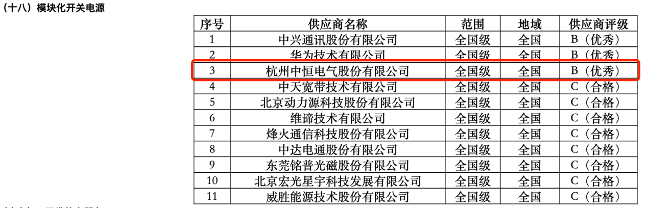 近日,中國鐵塔公布了2023年度總部一級集采供應商分級評價結果,中恒電氣的“模塊化開關電源”產品榮獲優秀供應商(B)評級。